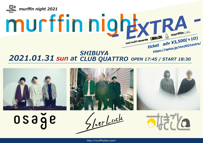 <murffin night 2021 – EXTRA ->と題した本公演は1月31日に東京・渋谷CLUB QUATTROにて開催されるもの。murffin discs主催の新人オーディションで2018年にグランプリを獲得したosage、準グランプリを獲得したなきごと、2019年にグランプリを獲得したSherLockが出演する。