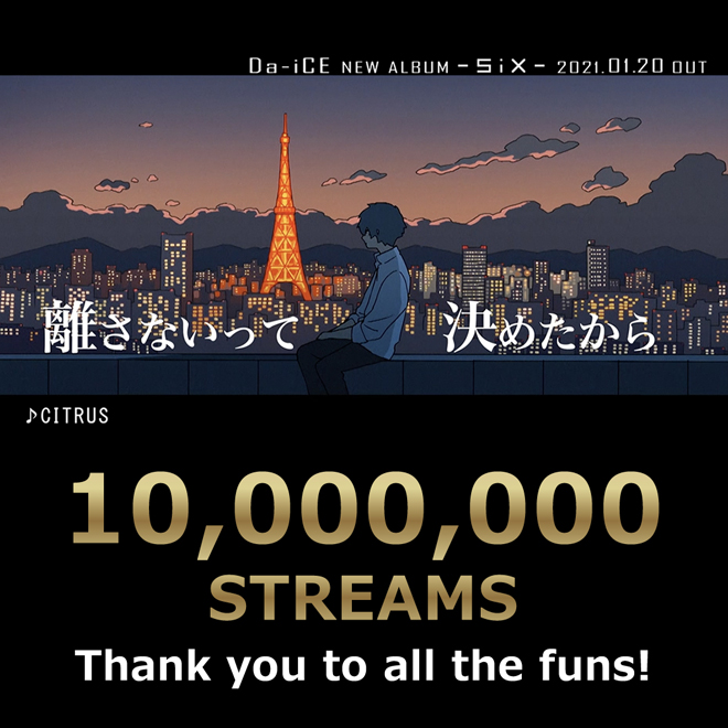 Da-iCEの楽曲で日本テレビ系日曜ドラマ『極主夫道』主題歌として起用された「CITRUS」のストリーミング再生回数が、累計1000万回を突破した。