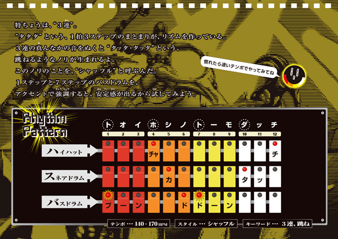 言わずと知れた世界のスーパースタンダード“TR-808”は、発売から40年以上が経過した今でも、そのサウンドを耳にしない日がないほど。80年代前半にヒップホップ、ハウス、テクノの創始者たちが使いはじめ、新しい音楽誕生のきっかけをもたらしたことから、ダンスミュージックを象徴するアイコンとしても、世界中で愛されている。本書では、そんなTR-808のこの上なくシンプルなインターフェースをお手本に、カラフルなボタンからなる“808マナー”で、全てのリズムをわかりやすく表した。