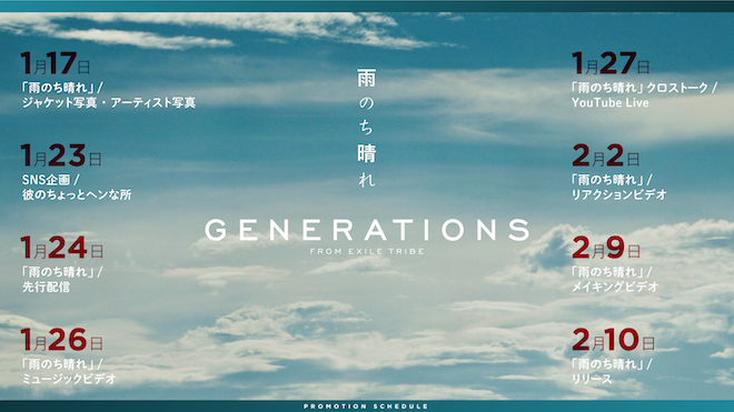 あわせて2月10日発売のニューシングル「雨のち晴れ」のジャケット写真も解禁となった。今回のジャケット写真は表題曲の「雨のち晴れ」にちなんでGENERATIONSメンバーのツイている日、ツイていない日を表現した写真で構成されている。