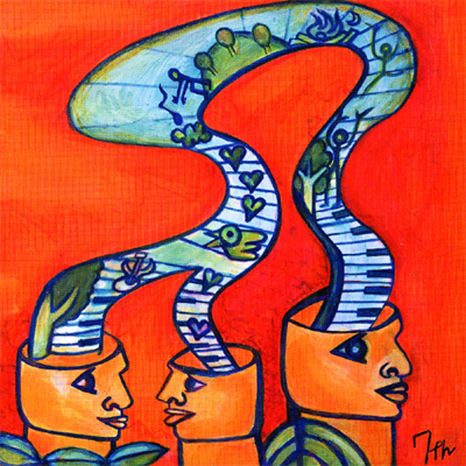 hake:静かで感傷的な夏の終わりですね。オープンチューニングのアコギ1本で始まり、ベーシックはヴァイオリン、ウッドベース、ストリングスで、最後にドラムとレイナのスキャットを入れて。野原でアコギを弾いているうちに夢想が広がって、最後は雲の上まで行ってしまうイメージになりました。サイケなトリップ・ミュージックです。