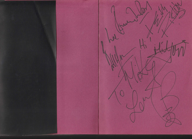 今年から毎回僕のちょっとしたお宝を自慢させていただく(汗)。ローリング・ストーンズ関係が多くなっちゃうけどその辺はお許しを…。というわけでトップ・バッターはりストーンズ。拙書『THE ROLLING STONES 大百科』表紙の次の“みかえし”のところにミック・ジャガー/キース・リチャーズ/ビル・ワイマン/チャーリー・ワッツ/ロニー・ウッドの5人の連名サイン。To Mike入りでこれはチャーリーに記して貰った。1990年初来日時に“完成”した。