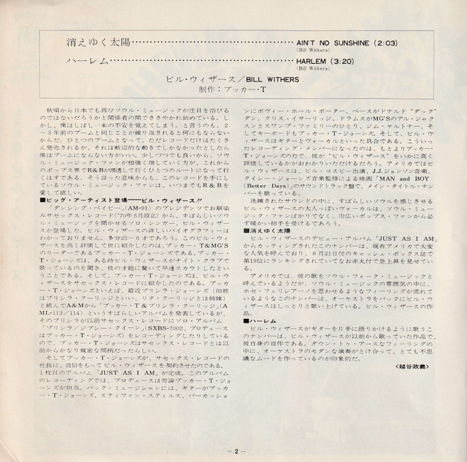 書いたり喋ったりの音楽紹介屋になってもう50年以上。ビル・ワイマンのように自分コレクターでないし、手帳も殆どどっかに行ってしまっている。何たって初めてハワイで堪能したエルヴィス・プレスリー(1972)やローリング・ストーンズ(1973)の計6枚のTIXも行方不明。その日暮しに追われて月日はあっという間に…。数日前、湯川れい子先生と電話ミーティング中に自分の原稿を纏めるのにはどうしたらいいのかなんてことを話したけど良いアイディアが浮かばなかった。というわけでもないんだけど、今年から毎回ライナノーツが中心になると思うけど僕の拙い原稿をアーカイヴさせて頂く(再汗)。まずは昨年81歳でこの世を去ったビル・ウィザースのシングル「消えゆく太陽」(1971年発売)。