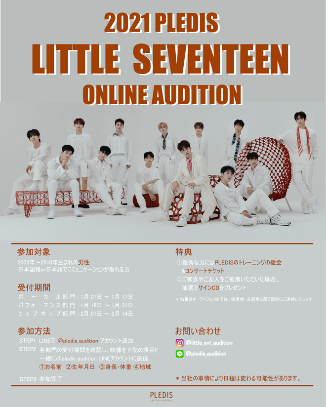 このオーディションはPLEDISが才能と可能性を兼ね備えた日本人練習生を選抜するために開催するもので、日本国籍、または日本語でコミュニケーションが取れる2003年〜2010年生まれの男性が参加対象になるという。“第2のSEVENTEEN”を発掘するという意図のもと、“ボーカル”、“パフォーマンス”、“ヒップホップ”と、SEVENTEENの形態に合わせた3つのユニット別に応募受付が行われる。1月1日から17日までのボーカル部門に続いて、18日から31日までパフォーマンス部門の受付を実施中。2月1日からヒップホップ部門の受付が開始される予定となっている。