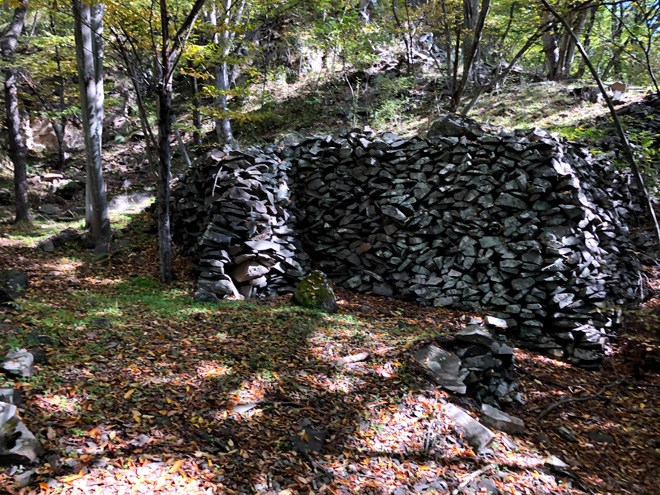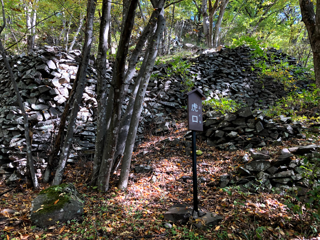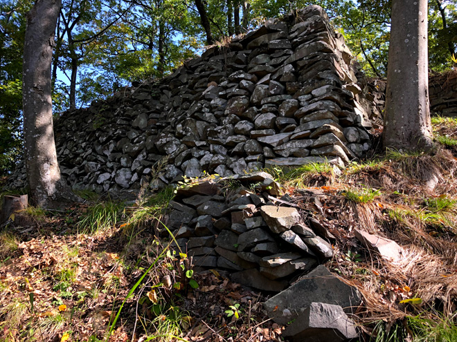 ここからひたすら山を登って行くわけだが、途中に岩がたくさん出て来て、山全体が岩山なことが一発でわかる。石切り場があり、ここで石を切り城内に運んでいたこともわかる。