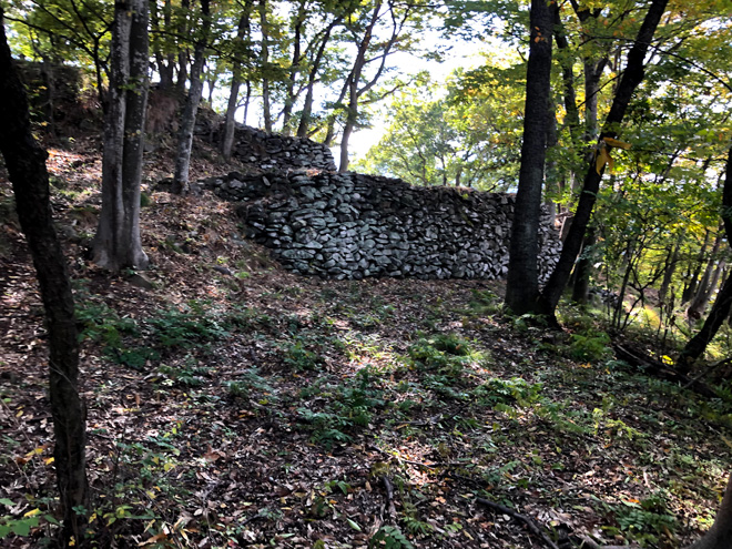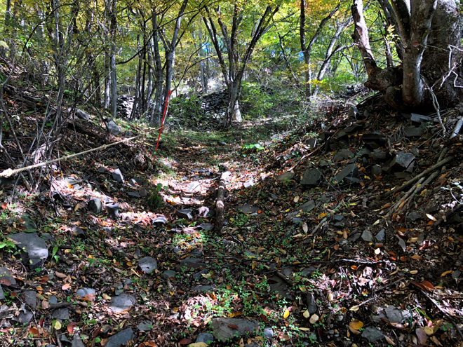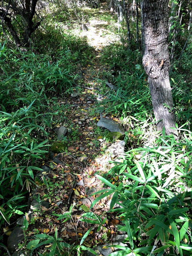 先程書いた大手正面から右に廻った先の曲輪群であるが、本郭の裏の辺から降りる導線があるので、是非下まで降りて段になった石垣を見上げてほしい。ここも本当に素晴らしい。こちら側の石垣を中心に防御を固めていたことがわかるので、何か相当な理由があったのかもしれない。足元に石を敷き詰めた細い道も発見出来た。両サイドには排水溝もちゃんと作られている。戦国の城に一瞬の雅な感じ、もしかするとこの辺一体は女性や子供が生活する曲輪として機能していたのかもしれない。確かにこの辺一体はアップダウンがなく、大手の横にあった井戸跡までフラットになっている。我々の職業はフラットなんとかというローンは組めない。というかローンが組めない。どうしても木や雑草がボーボーに生えていて、それをイマジンすることが難しいかもしれないが、城の縄張りや地形が頭に入ると実に良く出来た城だということがわかりよっぽど感動する。