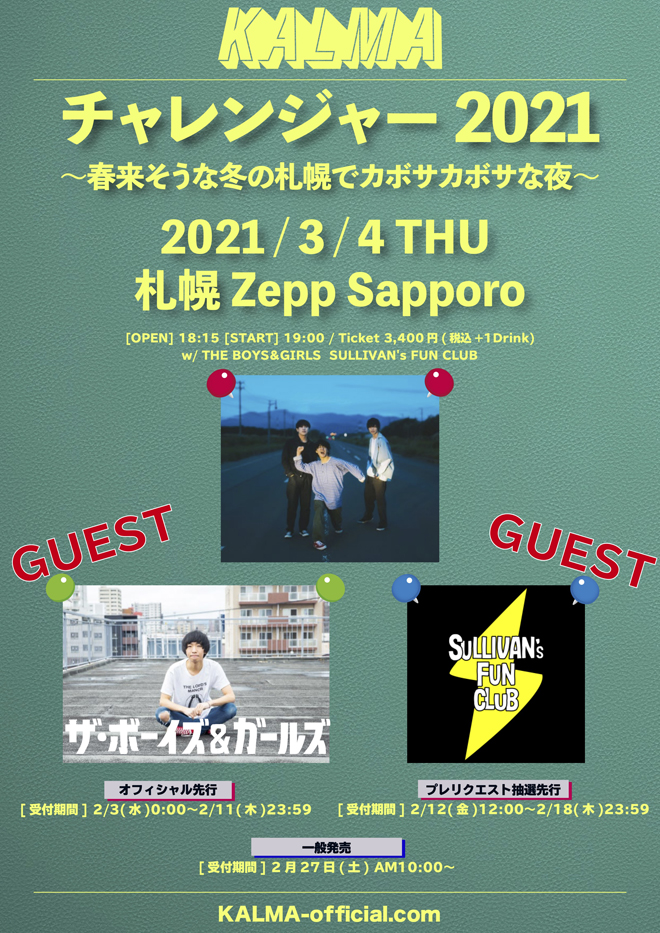 また、合わせてメジャーデビュー1周年となる3月4日に、地元・北海道のZepp Sapporoにてイベント<チャレンジャー 2021 〜春来そうな冬の札幌でカボサカボサな夜〜>を開催することも発表。対バンにTHE BOYS&GIRLSとSULLIVAN’s FUN CLUBを招くことも決定しており、チケットの最速オフィシャル先行がスタートしている。