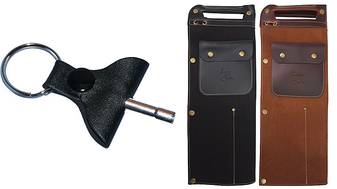 LM Products、本革を使用したドラム・キー・リング「IA-8」とスエード・レザーのドラムスティック・バッグ「STB-1」