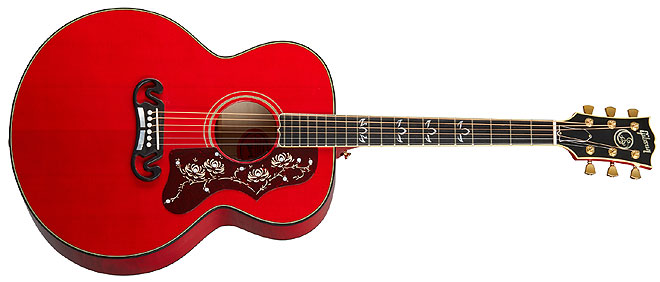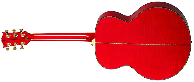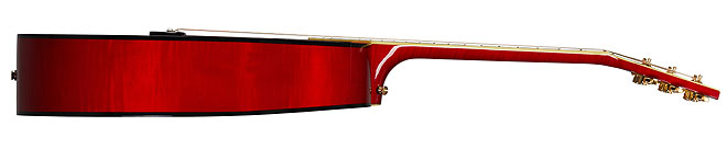 鮮やかなチェリーのニトロセルロース・ラッカー・フィニッシュで仕上げたAAAシトカ・スプルース・トップとメイプル・バック、ゴールドのGrover Keystoneチューナー、アンダーサドル・タイプのピエゾ・ピックアップLR Baggsオリアンティ・システム、サウンドホールにマウントされたプリアンプとコントロールなども特徴的だ。