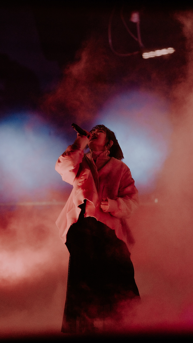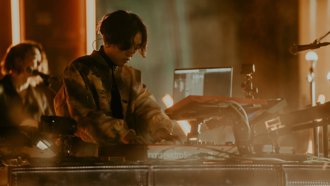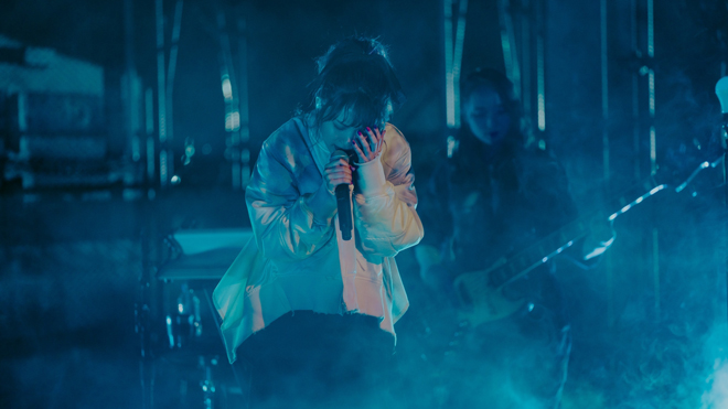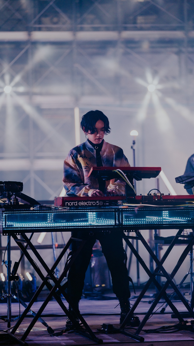 メンバーそれぞれ持ち寄ったマグカップで仲良く乾杯した後鳴り響いたのは、不穏なカウントダウン。自身初となるTVアニメ主題歌として書き下ろされた「怪物」で場の空気は一変する。過剰なほど炊かれたスモークとタイトかつアグレッシブな演奏、そしてここでも180°違う表情を見せるikuraのボーカルワークで、2021年の新しいYOASOBIの一面を覗かせた。立ち上るスモークも消えぬままに、先月発売された初のCD『THE BOOK』の幕開けを告げるインスト曲「Epilogue」のフレーズが。「明日も明後日も、音楽が鳴り続けますように。」ikuraの祈りともとれる言葉から、「明日世界は終わるんだって」という「アンコール」の歌い出しに続ける演出で、YOASOBIというユニットの持つ物語性を強く印象付けた。