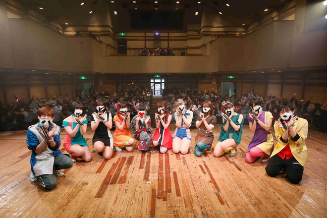 また、民族ハッピー組が応援に駆けつけ、司会のお笑いコンビ・ジャガーズのふたりも含め全員で「ハッピー♡バレンタイン」と書いたマスクパフォーマンスで国生さゆりの「バレンタイン・キッス」をカバー。続けて、彼女たちの2月17日(水)発売の新曲「試験管ライフケミストリー」「代田橋ラプソディー」を歌ってステージに花を添えた。