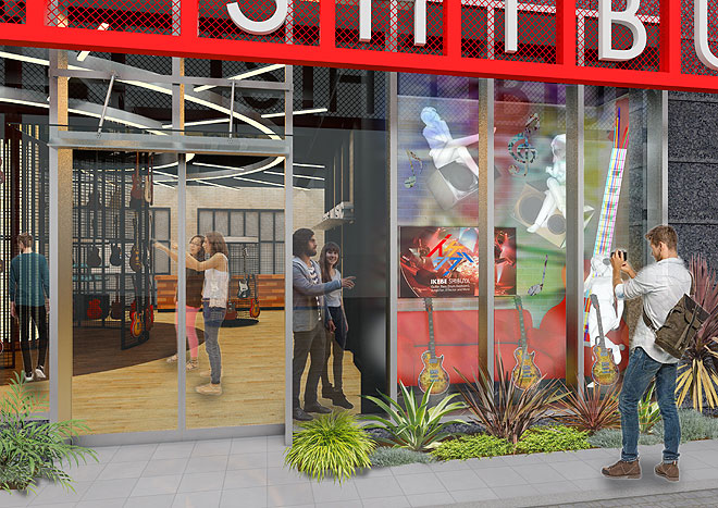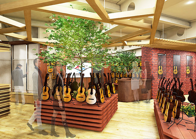 「イケシブ」は、楽器専門店が一堂に会した総合旗艦店であると同時に、エンターテインメント・カルチャーの発信基地としての側面も持つ“音楽・楽器の次世代型ストア”。音楽はすべての人に開かれた多様性の象徴であり、老若男女だれもが気軽に立ち寄れて心地よく過ごせる場所でありたいという思いから、今まで楽器を購入するための場所だった店舗空間そのものを、そこにいるだけで楽しくなるようなエンタテインメント空間とした。