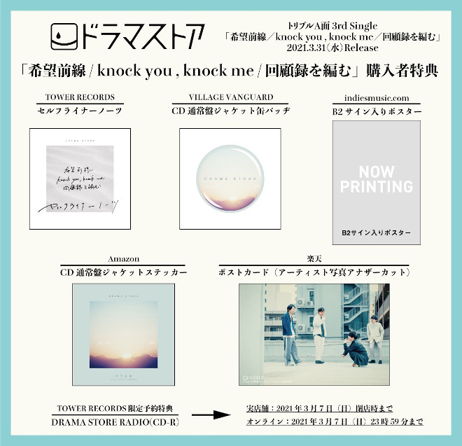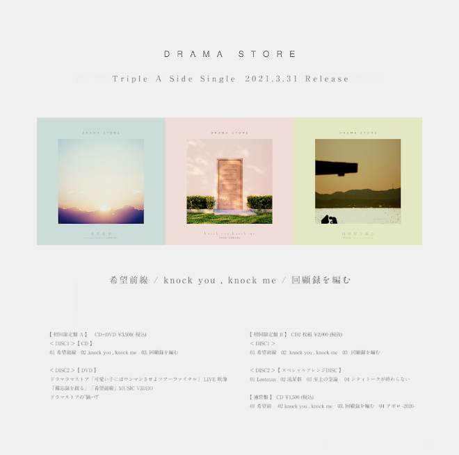 ドラマストアが、3月31日リリースのトリプルA面シングル「希望前線/knock you , knock me/回顧録を編む」のジャケット写真3枚を解禁した。今作は、初回限定盤A、Bと通常盤の3形態でのリリースで、トリプルA面ならではの、それぞれの楽曲に紐づいたジャケット写真となっている。
