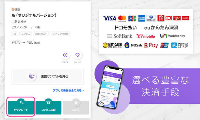 ・楽譜データダウンロード:スマートフォン/タブレット/PCでキャッシュレス決済し、楽譜データ(PDF)をダウンロード購入できるサービス