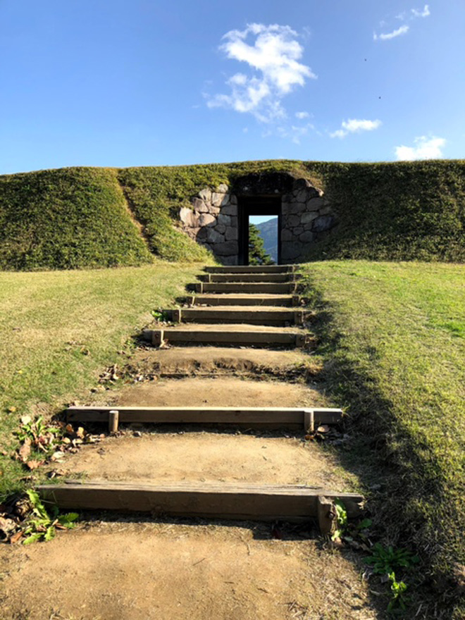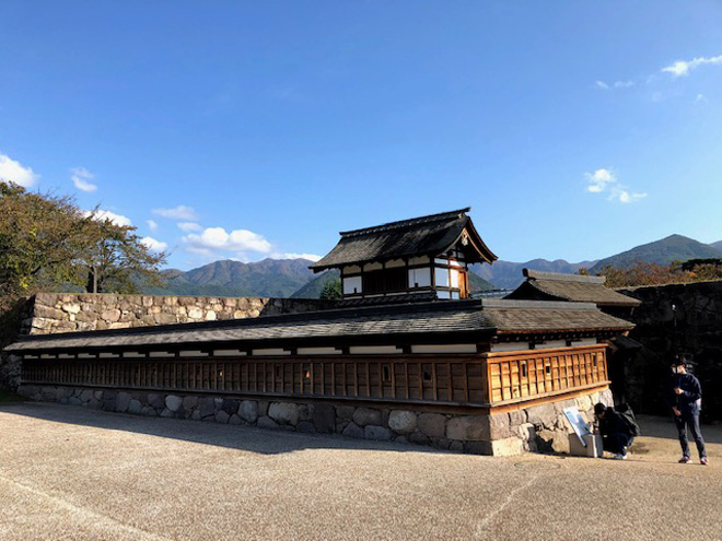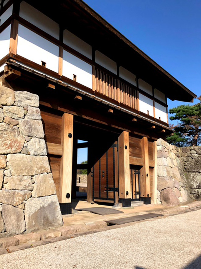 そんな戌亥櫓のすぐ裏に土塁の中をくり抜いた埋門も復元されている。これは見た目とアイディアがとても面白い。石垣で周りを固めて、門はきっと木で作った扉であっただろう。二の丸の行き来を遮る役目を果たしており、当時はこの土塁の上も土塀が張り巡らされていたとも考えられる。もしかすると最初はここに門などなく、でも導線的にもここに通り口が必要となり、単に土塁を切り開いた導線にするよりも穴にして石垣で支えた門にしようとなったのかもしれない。とても面白い発想である。