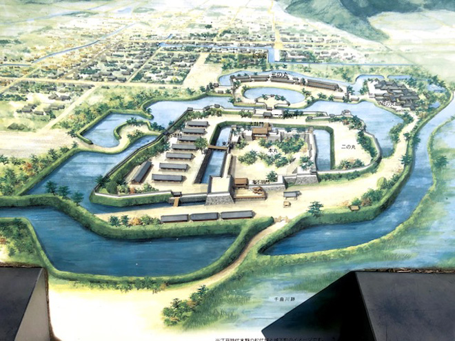城内には武田の城から始まったことで武田氏よろしくな三日月堀が作られていた。残念ながら現在は埋め立てられてしまったが、平面図には見事な三日月堀が書かれている。これも発掘と復元が可能なはず。新たな建造物を建てるよりも仕上がりは早いと思うのだがどうだろうか?水を湛えた三日月堀の復元なんて城ファンからすると最高なニュースだ。千曲川を外堀にしつつ、城内の水堀は千曲川から引いている。堀の数も多く、堀の面積も広く、平城なだけに土浦城と同じく水に浮かぶ城だったことがわかる。平地に建てた城は、堀、または水堀を巡らせないとすぐに攻められてしまう。もっと城内のスペースを増やせたのでは?とも思うほど堀の面積を広くとってあるのが海津城の見所だ。
