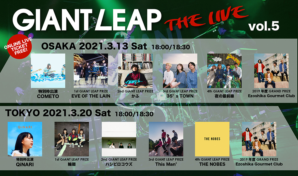 アマチュア・ミュージシャンの活動を様々な面からサポートするアーティスト育成プロジェクト<GIANT LEAP(ジャイアント・リープ)>主催によるライブイベント<GIANT LEAP THE LIVE vol.5>が東阪2公演で開催される。このたび、同イベントの特別枠出演アーティストが発表された。