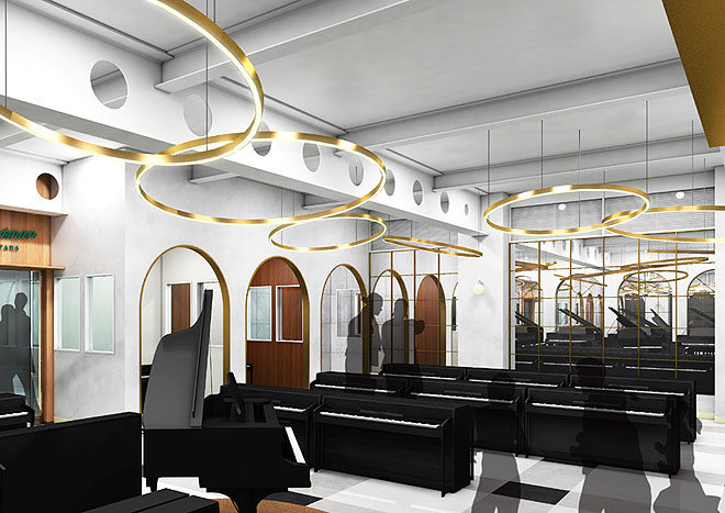 幅広い音域と表現力。演奏技術の上達とともに自分自身までもが磨かれていくような感覚。そんなピアノの特性が、店舗空間には表現されている。白ベースの内装と壁面ミラー、天井を飾るゴールドのリングからは上質感が漂う。感性が磨かれ、ワンランク上の自分へと駆り立てるような時間がここにある。