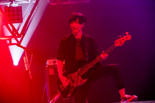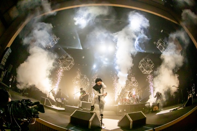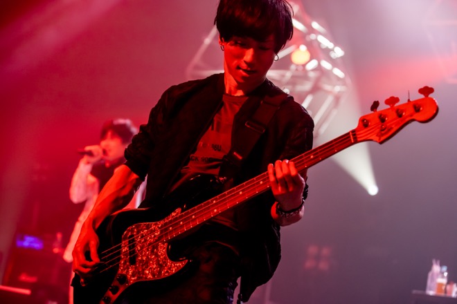 「ネガポジ(Negative&Positive)」に雪崩れ込み、そのサビを迎えるといろとりどりのライトが点滅し、田澤、杉本、貮方が呼吸を揃えてジャンプをみせた。さらに燃料を投じるように「ガーリッシュマインド」を放つと、エフェクトで声を歪ませ咆哮するように杉本が歌う。田澤も歌いながら、右、左、右と交互に腕を挙げて全身で表現。メンバーは立ち位置を離れ入れ替わり、ステージをダイナミックに動き回る。コール&レスポンスが繰り広げられるパートでは、ファンは突き上げる拳に心の声を込めているようだった。メンバーはそれぞれに会場を見渡し、観客とコミュニケーションを図っていた様子だ。貮方はステージ脇の花道に歩み出て、ファンとの距離を縮める。「みんなの声が聞こえる気がする」と呟いた田澤は「Say,oi oi oi!」と繰り返し、声を次第に荒げていき最後は絶叫へ。「ラスト行くぞ! 悔いの残らないように!」と何度目かも分からなくなるほど繰り返したサビに突入する。高井は後方で台に乗り、髪を振り乱して荒々しくプレイしていた。火花が勢いよく噴出するステージで最後の音を全員が鳴らすと、拍手喝采が割れんばかり。間髪入れず、ドラムカウントから「いつか」へ。客席が明るく照らされた視界良好な会場。大きく脚を開き、真っ直ぐな歌声を全身から轟かせる田澤の“いつか、死ぬ僕たちは。”という歌詞が、歌も演奏も、一音一音に思いきりアクセントを付けたような力強さで、胸に楔を打ち込んでくる。浮き彫りになったのは、“生きている”実感だ。渾身の歌、コーラス、演奏、そのすべてに射抜かれる本編ラストの1曲だった。