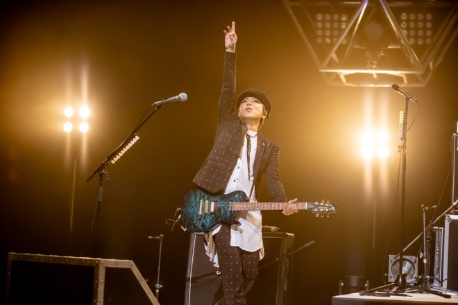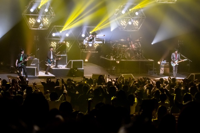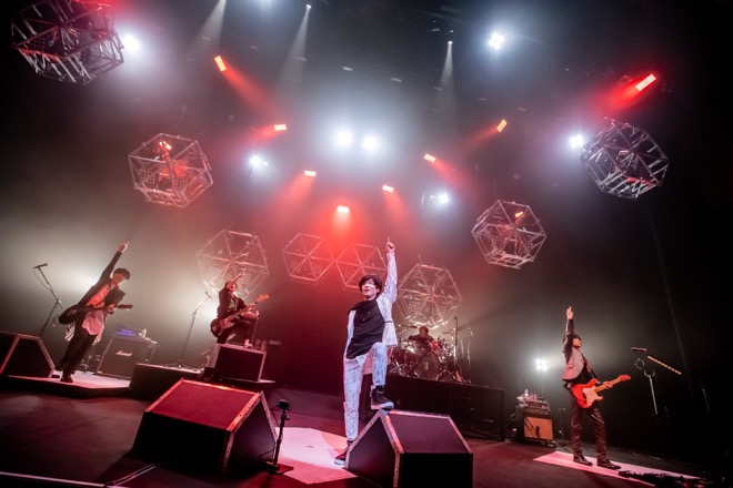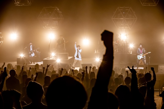 定刻を15分ほど過ぎてオープニングSEが流れると、手拍子が起きる。ステージ中央奥からメンバーが一人ずつ登場し、最後に姿を現した田澤孝介(Vo)が両手を広げると拍手が一際大きくなり、スタートしたのは「春色」だ。包み込む日差しのような柔らかいピンクと黄色のライトのもと、一音一音を噛み締めるようにゆっくりと歌い、鳴らすメンバーたち。間髪入れず「FAKE」に突入すると、「渋公! Waive20周年記念公演にようこそ!」と田澤が叫び、杉本善徳(G)、貮方孝司(G)、高井淳(B)が前へ出て一列に。サポートを務める山内康雄(Dr)はパワフルなドラミングでボトムを支える。ヘッドバンギングしたり手を頭上でワイプしたりと、メンバーも観客も全身を動かして音に没入した。