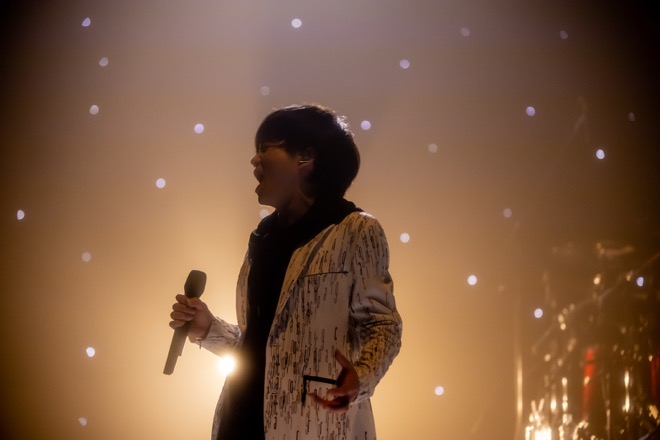 集中して聴き入っていた会場が静寂に包まれたまま「C.」が始まると、杉本と田澤が交互に歌い、時にハーモニーを響かせて、しっとりとした空気を醸し出す。終盤を迎えると強い光がステージを照らし、銀河に輝く天の川のような星々が背景に出現。ロマンティックなムードが最高潮を迎えたところで、「BRiNG ME TO LiFE」のピアノイントロが鳴り響く。2019年の再演時にツアーで披露された新曲である。悲喜こもごもを映し込んだように、表情が移り変わっていくメロディー。田澤の熱唱に、杉本、貮方、高井が“♪ラララ”とコーラスを重ねるのもエモーショナル。逆光の中シルエットとなって曲を終えると、熱い拍手がいつまでも鳴り響いていた。