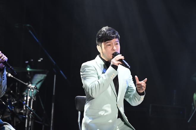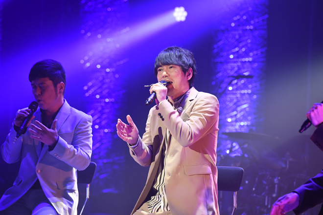 ここで一旦ランキングの発表はブレイク。本来は2月26日、27日が苗場公演の予定日だったことに触れ、ピアニストで「永遠(とわ)に」の作曲者でもある苗場公演にはおなじみの妹尾 武を呼び込む。6人は苗場の思い出を語り合い、妹尾 武がオリジナルのピアノ曲「サクラ咲ク」を披露。再びゴスペラーズがステージに姿を表し6人で延期となってしまったファンクラブツアーで演奏予定だった「Simple Words」を奏でた。妹尾 武を送り出しトークは3月10日にリリースされるアルバム「アカペラ2」の話題に。18年4ヶ月ぶりのアカペラアルバムとなる今作を「220ヶ月待ちましたよ」と北山陽一は語り、アルバムに収録される「誰かのシャツ」「風が聴こえる」を続けてライブ初披露した。