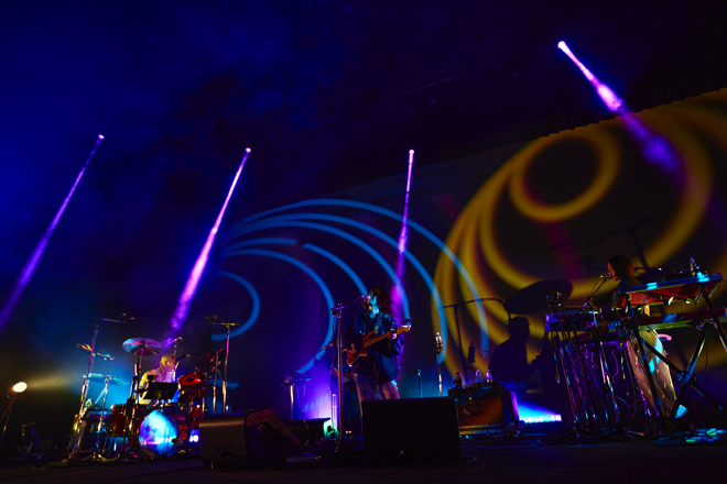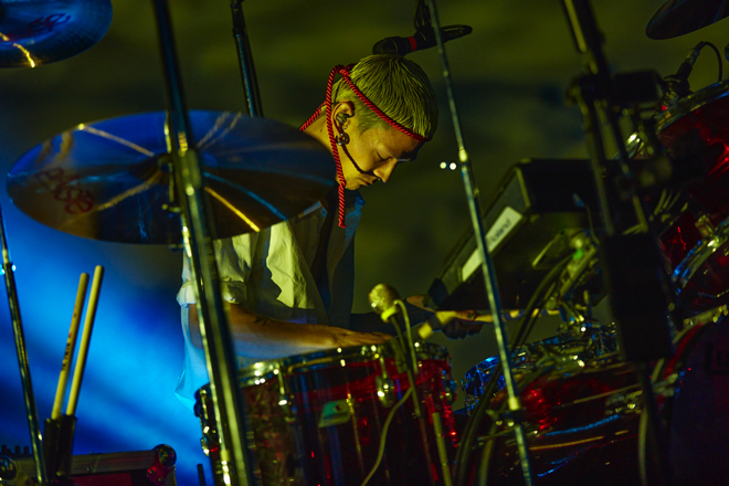 インストの「未知との遭遇」からシームレスに繋いだ「my name is GREENMAN」も序盤のダビーな雰囲気から途中でジャズファンクへと変化し、ラストに置かれたストロボがたかれる中での轟音パートはかなりサイケデリック。バンドのポップサイドを象徴する「どうしよう」を挟んで、ライブ中盤では「Festival」、「革命前夜」と初期の曲を続けると、ダンサブルな「新世代」でこの日最初のピークを作り上げた。