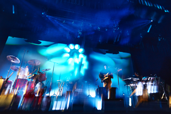 その後はアッパーな曲を連発し、「のめりこめ、震えろ。」では間奏で小原綾斗がステップを踏みながらノイズギターをかき鳴らし、「SONIC WAVE」ではコーラスパートでAAAMYYYが右手を突き上げてオーディエンスを煽り、ファンキーな「Austin Town」と続けて行く。会場が中野サンプラザということで、爆風スランプの「大きな玉ねぎの下で」が流れる中、John Natsukiがお馴染みのサンプラーを用いた挨拶をするというシュールな一幕に続いて披露されたのは、移籍第一弾として配信された「EDEN」。ミニマルなループのリズムが小気味いい前半から一転、「Seven Nation Army」のような太いギターリフとともに、豪快なロックドラムへと切り替わる曲展開は、やはりライブでのカタルシス十分だ。
