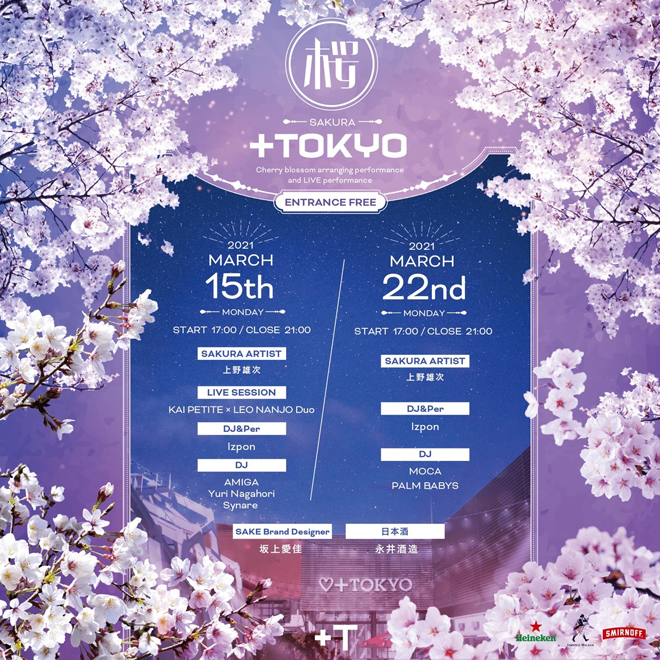 期間中は巨大な桜と音楽を、手ぶらで楽しめるBBQをはじめとする「PLUSTOKYO」スペシャルメニューとともに堪能できる。また3月15日(月)と3月22日(月)には花道家・上野雄次氏による「桜のはないけ」ライブパフォーマンスも行われ、豪華DJ陣・ライブバンドによるセッションは必見の内容となっている。