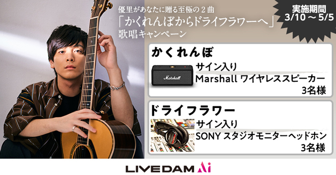 DAMではこの2曲を課題曲にしたキャンペーンを3月10日より実施。「かくれんぼ」を歌唱すると「サイン入りMarshallワイヤレススピーカー」が、「ドライフラワー」を歌唱すると「サイン入りSONYスタジオモニターヘッドホン」が抽選で当たる。応募は、デンモクのキャンペーンページから楽曲を予約すると表示されるQRコードより。