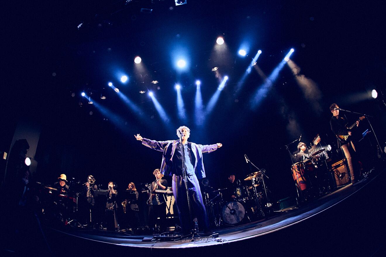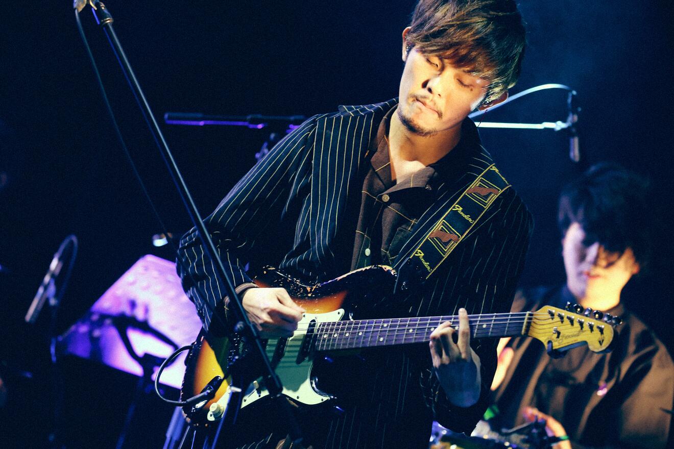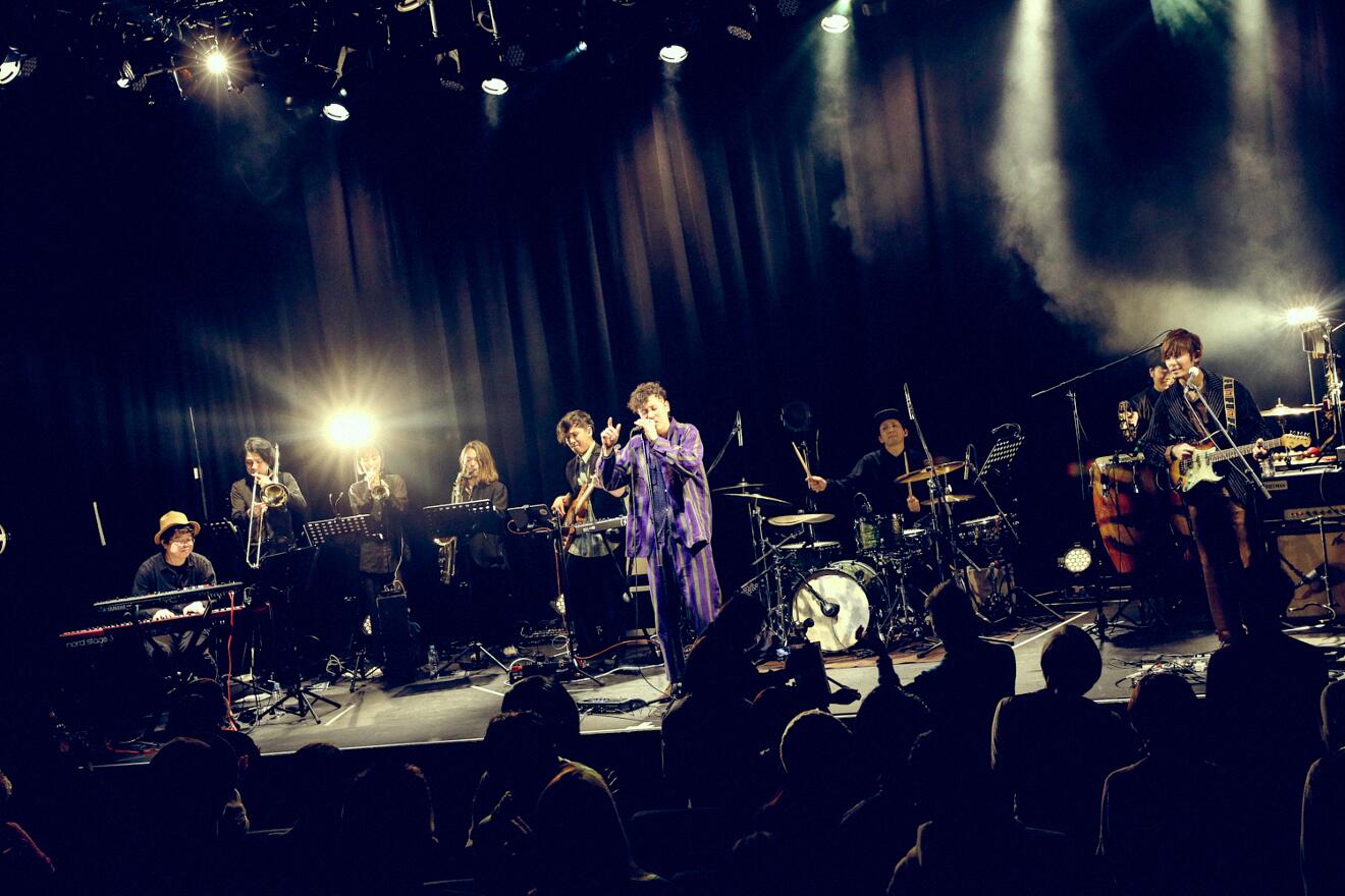 ホールライブで、しかも人数制限されていると思えないほど温まったところで、TAKKIがメンバー紹介。ホーン隊を「イケメン!美女!小さいおじさん!」(それぞれ寺谷光(Tb)、大泊久栄(Tp)、永田こーせー(Sax))呼ばわり(!?)するなど、声を出さずに笑ってしまったのだが、その後、TAKKIが重大発表。「我々、二人で細々とやってきまして、4曲のデジタルシングルとEPをリリースしてきましたが、5月に出すアルバムはIRORI Recordsから出ます」と言うと、SOTAがすかさず合いの手を挟む。わざわざTAKKIの横に並びに行ったのも面白いといえば面白いし、優しい。楽曲を聴いているだけだと分からない二人の関係性が窺えて、様々なタイミングで出会ったファンやリスナーが大きな拍手で祝ったのも納得だ。しかもデビューEPの表題曲は彼らが初めて作ったという、今や稀少な自主盤に収録されている「Slow dance」という曲で、その音源を持ってライブハウスへ出演交渉をしに行ったのだという。「このタイミングで、この曲でデビュー、いきましょうって、こんなありがたいことってないです」とTAKKIが感謝を述べ、さらにリリース記念の東京、大阪でのライブも発表した。