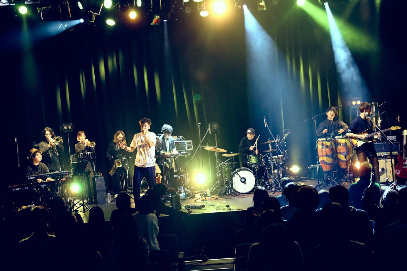 一連の発表に続いて9人編成で「Slow dance」を披露。流れるような爽快なギターから始まり、グッとファンクネスが増すサビへ飛翔するポップチューンで、早くも大きな会場で見たい気持ちが芽生えた。そしてメンバーのソロ回しも白熱した「Stand by me」を経て、本編ラストは壁面に木の影が映し出され、陽の光を感じさせる演出の中、生音のアンサンブルの有機的な心地よさに背中を押される「Morning」。聴き手それぞれの日常に寄り添うグルーヴ。様々な色合いの楽曲がありつつ、そのことがSOMETIME’Sの軸にあるのだろうと実感する演奏だった。