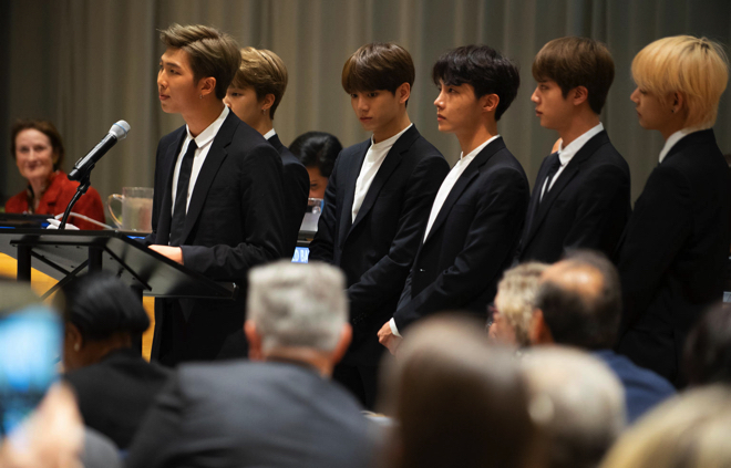 ▲ユニセフのグローバル・サポーターであるBTSは、ニューヨークの国連本部で、世界中の若者たちに向けて、「自分自身を語ろう」とメッセージを送った。(米国、2018年9月撮影)