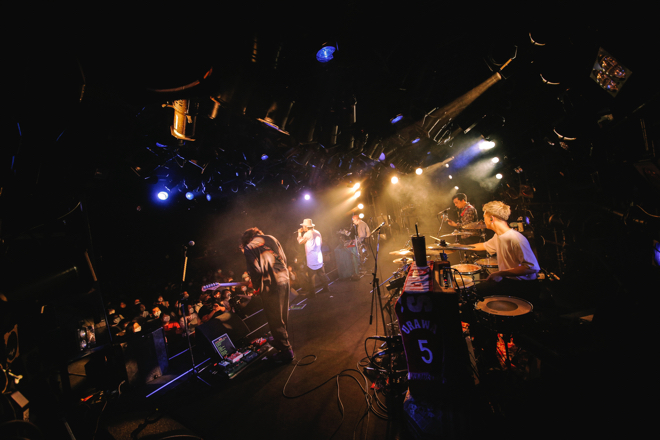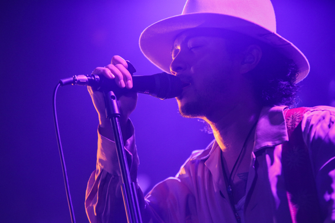 AKUN(G)、PETE(Tp,Key)、KAZUMA(Dr)の1人1人が描きならす音がピークに達すると、KENNY(Vo)がステージに登場し「The Night Is Still Young」でライブがスタート。“俺らのLIFEはこう 調子はどう?”と問いかけ、このツアー用にホーンを添えたダンサブルなアレンジでフロアの温度を一気に温めていく。