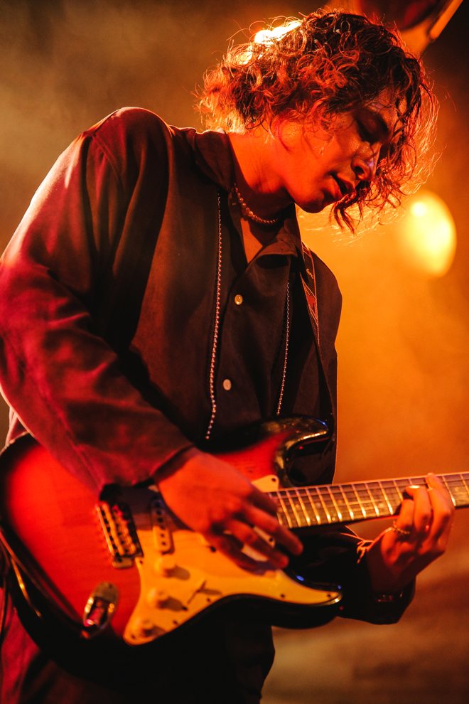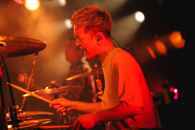 そんな静寂を遮るようにグルーヴィーなドラムがフィルインして始まったのは「Mellow Yellow」。自然と横に揺れたくなる気持ちの良いビートが、メロウに会場を包み込んでいくと、アウトロの勢いそのままに「BOHO」へとなだれ込んでいく。ギターとシンセのフレーズの応酬から、AKUNが心地よいディストーションサウンドでギターソロをかき鳴らすと、負けじとPETEがトランペットを吹き鳴らし、最後はKAZUMAがビートを自在に操るようなドラムソロで会場を魅了していく。