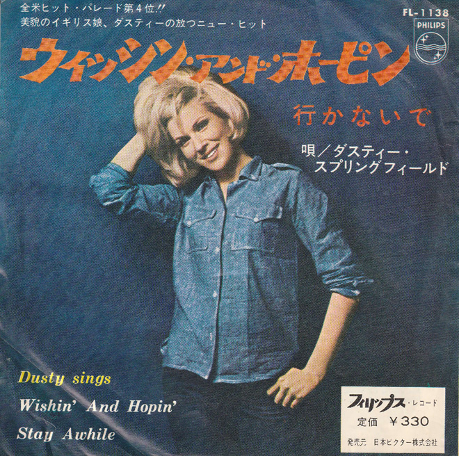 1963~1965年頃に僕が夢中になって聴いていたUK女性歌手はヘレン・シャピロ、ルルそしてダスティー・スプリングフィールド(1960年代から彼女のレコードを購入していたファンはどうしてもダスティーと、“ー”表記にしてしまうのだ)の三人。いずれも白人ながらとっても黒っぽいフィーリングの唱法で僕らを魅了した。USのティミー・ユーロ やブレンダ・リーのように……。1964年夏、FENから毎日のようにダスティーの「Wishin’ And Hopin’」が流れて来た。元々はバート・バカラック(当時はバート・バカラッチャなんて呼ばれていたよ、ケイス・リチャードの様に……笑)とハル・デイヴィッドがディオンヌ・ワーウィックの為に共作した作品。当時はUKアーティストがUSソングライターの楽曲をいろいろ探し求めていた。ストーンズもそうだったんだ。ダスティーのこの「ウィッシン・アンド・ポーピン」はBillboard誌HOT100の6月20日付79位★初登場、その後61位★→44位★→27位★→12位★→9位★とランク・アップ。最高位6位を8月1日付★、8日付、15日付の3週で記録している参考文献:JOEL WHITBURN PRESENTS THE Billboard HOT100 Charts The Sixties)。東京オリンピック開催前後だと記憶しているが、ダスティーの「ウィッシン~」日本盤シングルをゲット、今でも大事な一枚なのだ。