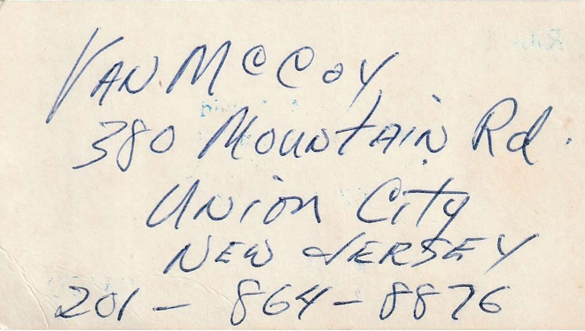僕が日本武道館で初めてMCしたのは1976年のヴァン・マッコイ公演。ファンキー・マイクって呼んでくれ、僕が名刺を渡すとロード・マネージャーの名刺の裏面に直筆で住所を書いてくれた。お父さんも同行していた。その3年後、ヴァン・マッコイは39歳の若さで急逝。彼はソングライター/プロデューサーとしても活躍、僕の大好きなバーバラ・ルイス1965年大ヒット「Baby, I’m Yours」は彼の作品、武道館楽屋でその話しでも盛り上がった。