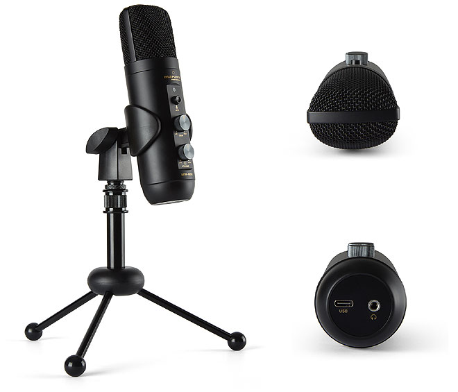 本体には、ヘッドホン音量ノブやマイク入力音量ノブ、ミュートボタン、3.5mmヘッドホン出力端子を装備。主要コントロール機能がアクセスしやすい位置にあるので、オーディオコンテンツの作成もスムーズに行える。低遅延レコーディング/モニタリングを可能にするUSB-C接続を採用し、マイク三脚スタンド、マイククリップ、USBケーブルが同梱される。