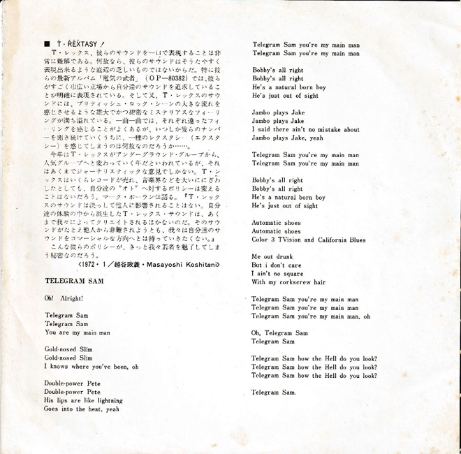 1970年代前半UKロック・シーンでグラム・ロック(魅惑的、グラマラスから由来)が台頭した。ハデハデ、煌びやかなファッション、メイクでサウンド云々というよりは見た目によるイメージでグラム・ロックは注目されたけど、彼らのクリエイティヴなサウンドはしっかりとロックしていて多くのファンから注目を集めた。特にマーク・ボランのT・レックスが先駆者で1972年初来日は実に印象深かった。実は彼らがまだティラノザウルス・レックスと名乗っていた頃のアルバム・ライナーも書いたけど、僕は彼らがとても好きだった。初来日前にリリースされたこのナンバーは本国でも大ヒット、ニュー・ミュージカル・エクスプレス/シングル・チャート(TOP30)では1月29日付12位に初登場、2月5日付2位、そして2月12日付で見事ナンバー・ワンに輝いたのだ。このシングルのライナーは故・石坂敬一さんからの依頼だった。彼はラメteeに革パンツ、マニュキュアというスタイルでキメて放送局や雑誌社をまわってプロモーション活動していたんだ。このライナーのヘッドで“T・REXTASY!”と記したけど、このフレーズは旧テレ朝通り”スピークロー”で石坂さんと呑んでいる時に浮かび上がった。