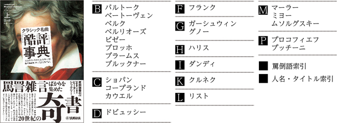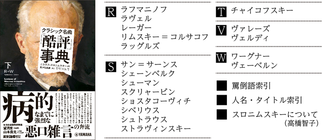 上巻には作曲家ピーター・シックリー(別名P.D.Q.バッハ)による序文と編者スロニムスキーによる前書きが、下巻には作曲家の望月京氏によるエッセイと文筆家・ゲーム作家の山本貴光氏による解説が加わり、本書をいっそう楽しむためのガイドとなっている。また、本書の大きな特徴とも言える「罵倒語索引」は必見。磨き抜かれた酷評表現の数々に、むしろその曲を聴いてみたい好奇心にかられる。いわゆる「名曲解説」は読み飽きたという方に、“劇薬”となる本書をおすすめしたい。