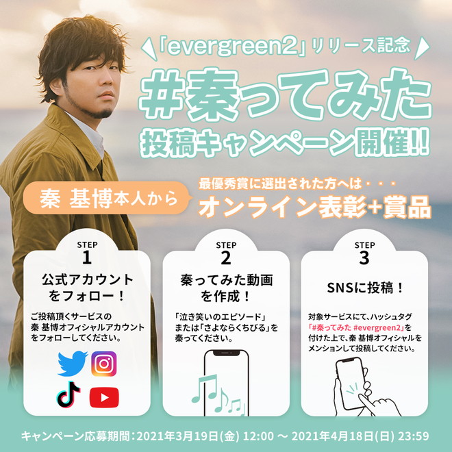 「ベストオブ #秦ってみた」最優秀賞に選出されると、秦 基博サイン入り<GREEN MIND 2021>ツアーグッズ詰め合わせに加え、直筆サイン入り最優秀賞盾がプレゼント。そして、5月4日(火・祝)の「みどりの日」に行われる『秦 基博 2021.5.4「evergreen2」購入者限定スペシャル配信イベント』にて、秦 基博本人からのオンライン表彰も予定されている。