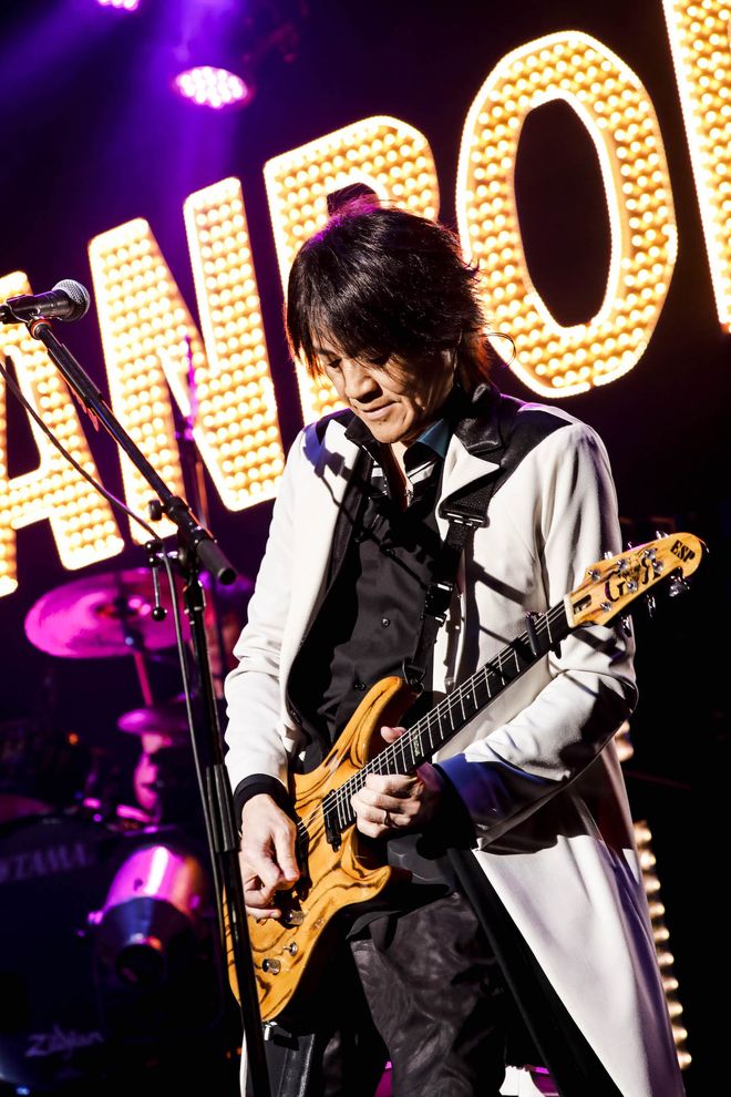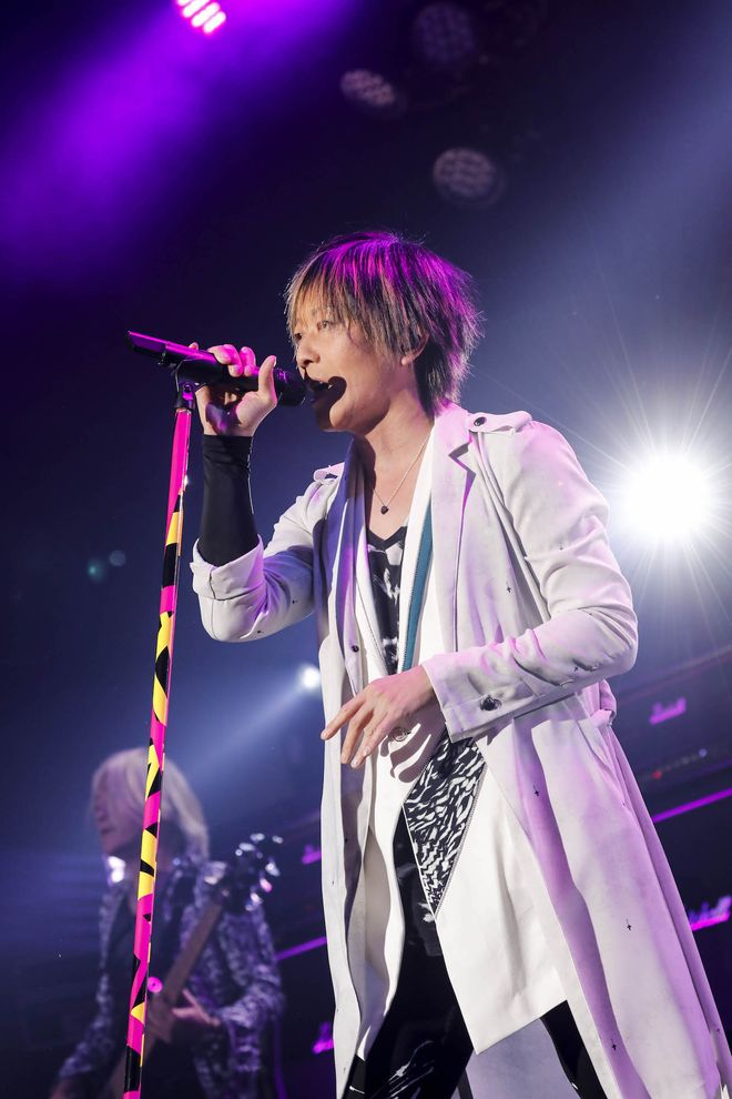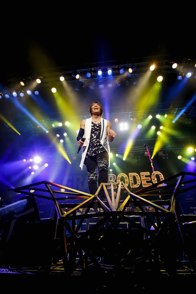 「次はアルバムの中から新曲を」とKISHOWが告げ、再びステージはそれまでとは違うカラフルな色に包まれる。e-ZUKAがニコニコと微笑みながらハンドクラップし、弾むようなファンキーなベースリフとキーボードが小粋なサウンドを織りなして届けられたのは、KISHOWがまろやかなファルセットとワイルドな歌声を交互に響かせる「オレンジピール」だ。おなじみのハードなGRANRODEOとは一線を画す、e-ZUKAのクリーンなカッティングとリズミカルなリフが、フレッシュなラブソングをジャジーなサウンドで彩る。キュートなセリフも飛び出し、声色を自由自在に操るKISHOWの滑らかなボーカルとフェイクがじつに心憎い。ハートウォームな空気は、愛しき者を失った想いを描くドラマティックなバラード「その愛と死を」でまたも一変。胸を締め付けるようなKISHOWの切ない歌声が、白いライトとともに客席に降り注いだ。