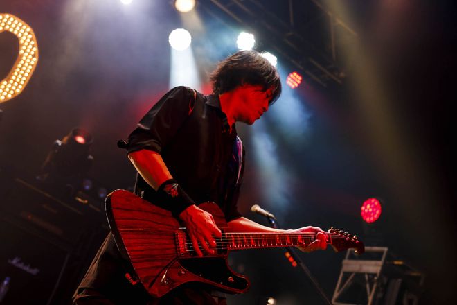 前日の大雨から一転、春の訪れを感じさせる晴天に恵まれたZepp DiverCity。開演時間の17時を回ると、暗転した場内にギターのハーモニクスの音色が、学園ドラマの『ロストマインズ』の世界観に合わせて、懐かしい学校のチャイムを鳴らす。フォークロアを感じさせるBGMをバックに、メンバーがシルエットとなってステージに現れると、沸き上がる大きな拍手。スポットライトを浴びたe-ZUKAが軽快なアルペジオを奏で出すと同時に、強烈なライトが客席を照らす。ステージ中央で両手を広げたKISHOWが躍動してスタートしたのは、最新ナンバーの「未来線を上って」だ。GRANRODEOとしては珍しい、白が基調の衣装も新鮮。爽やかなこの曲を主題歌に据え、放課後の学校での物語が描かれた『ロストマインズ』を想起させるオープニングに思わず頬が緩む。続く「妄想GRAVE」も『僕たちの群像』からの新曲。各種インタビューで、収録曲中、最もGRANRODEOらしいナンバーだと語られていたように、シンプルながらも骨太に“ロック”する。