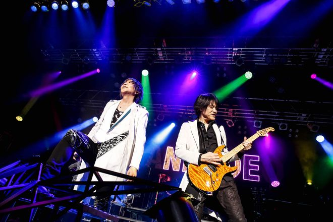 「いつだって愛って素晴らしいよねって曲やります!」と告げて弾むリフから始まったのは、ゴージャスなサウンドも魅力の「FAB LOVE」だ。KISHOWがクルリとロングジャケットの裾を翻して飛び跳ねてe-ZUKAが軽やかにダックウォークを決め、“愛”のナンバーに続いては、若き “恋”を歌うポップな「変幻自在のマジカルスター」へ。色とりどりに輝くライトが、青春の眩しさを思い出させる。MCでは、サポートメンバーの瀧田とSHiNがKISHOWやe-ZUKAと冗談を飛ばしながら、なごやかなトークで会場をゆるりとした雰囲気に包み込む。1年半振りの有観客ワンマンだからこその高揚感も手伝ってか、メンバーの仲の良さを感じる何気ない雑談も、いつも以上にテンポ良く賑やかだ。