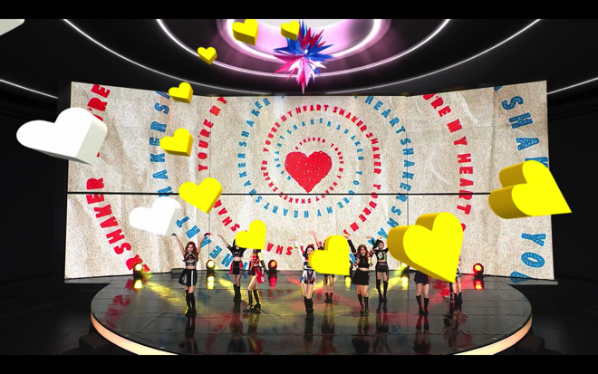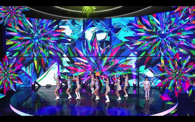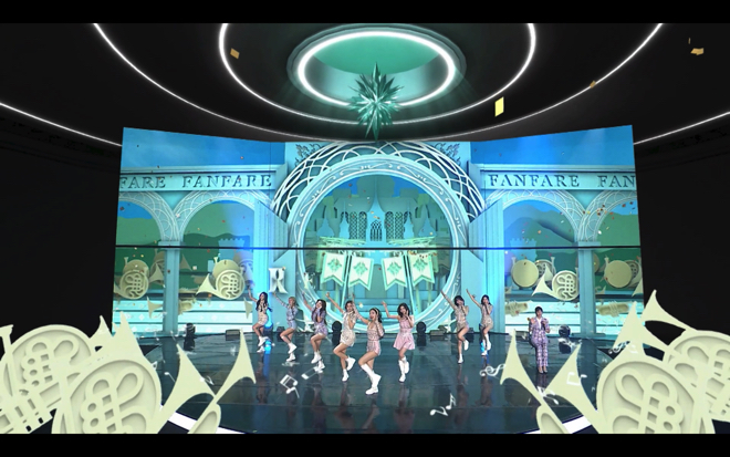 まず映像面では、曲ごとに次々と雰囲気を変える背景ヴィジュアルに加え、さまざまなデコレーションが画面に登場。頭上に輝く眩いクリスタルをはじめ、CGのポップなモチーフや鮮やかなレーザーは空間を浮遊し、メンバーの動きに効果的にシンクロ。仮想世界と現実世界が融合するオンラインライブならではの仕掛けに、多くのファンが胸を高鳴らせただろう。