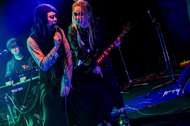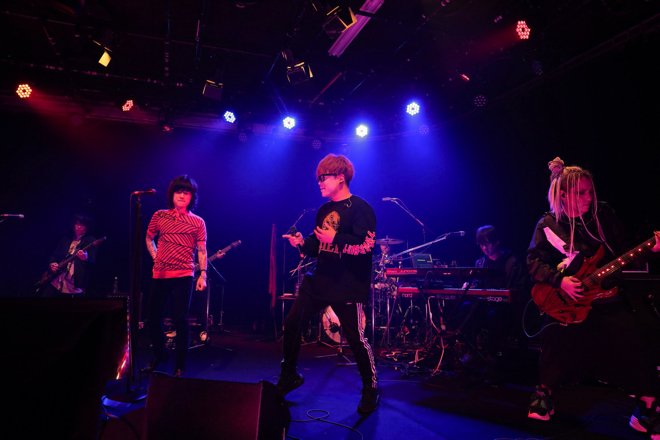 かくして、今宵の1番手として登場したのは、昨年9月にweb上にて活動を開始したNoGoDのヴォーカリスト・団長と、名うてのギタリスト・広末慧による新ユニット。ファーストデジタルシングル曲として発表された「ヨル」や、広末慧が近年サポートをしている亜沙の作ったボカロ界の名曲として名高い「吉原ラメント」のカバー、最新シングル曲「Switch」など計4曲をクール&スタイリッシュにパフォーマンスしてみせることになったのである。
