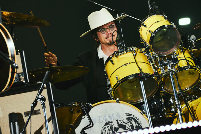 「こんな状況のなかでこれだけのライブができているのはみなさんのおかげです」とファンに感謝を告げる川上の視線の先には見覚えのあるドラムセットが置かれている。そして彼に紹介されて客席の通路を通って登場したのは、もちろんサトヤスだ。かぶっていた帽子を取ってオーディエンスに挨拶すると、ステージから歩いてきたメンバーひとりひとりとハグ(白井がやけに照れ臭そうなのがよかった)。そして始まった、「[Alexandros]の庄村聡泰」最後のパフォーマンス。4人だけで披露されたのは、ファーストアルバムからの「Untitled」だった。力強いキックに刻まれるハイハットにハイポジションのシンバル。すべてがサトヤスで、どこか懐かしかった。磯部も白井も何度もドラムの方を振り返り演奏していたが、きっと彼らも同じような気持ちだったのだと思う。誰がこの曲をやろうと言い出したのかは知らないが、《To celebrate your birth/I wrote the songs and words on whiteboard in you/To demonstrate your life/Throw away the songs/and fill them up with your words》という歌詞は、間違いなくバンドから新たな人生を歩んでいくサトヤスへのメッセージだ。曲が終わると、感極まるサトヤスの肩を抱きかかえながら4人揃ってステージに。何度も頭を下げつつステージを降りていくサトヤスに、客席からは改めて盛大な拍手が送られたのだった。