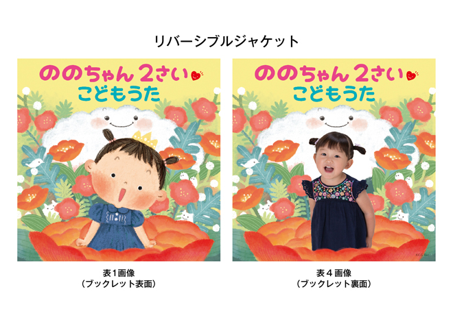 さらに、5月26日発売の初のソロ・アルバム『ののちゃん 2さい こどもうた』の収録曲情報、ジャケット写真、最新アーティスト写真も公開された。「とんとんとんとん ひげじいさん」に加えて、ののちゃんのお気に入りソングだという「おもちゃのチャチャチャ」や「ぞうさん」など童謡の名曲を中心に、2歳ならではの世界観を大切にアルバムを構成した。また、大ブレイクのきっかけとなった「童謡こどもの歌コンクール」で歌唱した「いぬのおまわりさん」の音源もボーナストラックに収録。元気なごあいさつも入った全11曲が収録される。ジャケットはののちゃんを描いたイラストを表1に、表4には親指姫のようなののちゃんの写真をいれたリバーシブル・ジャケットだ。