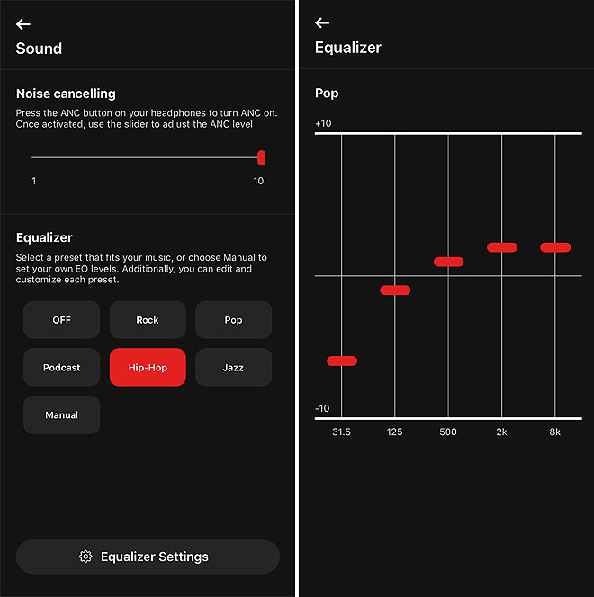 ▲「V-MODA app」はイコライザー機能を搭載。Manualを選べば帯域ごとに自由に調整可能。