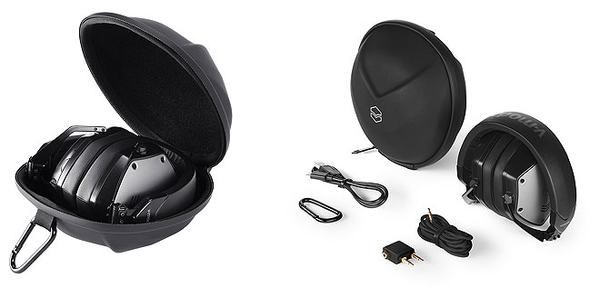 ▲持ち運びに便利なシェルケース(左)が付属。その他の付属品はオーディオケーブル、USB Type-C充電用ケーブル、航空機用変換プラグ、カラビナ。